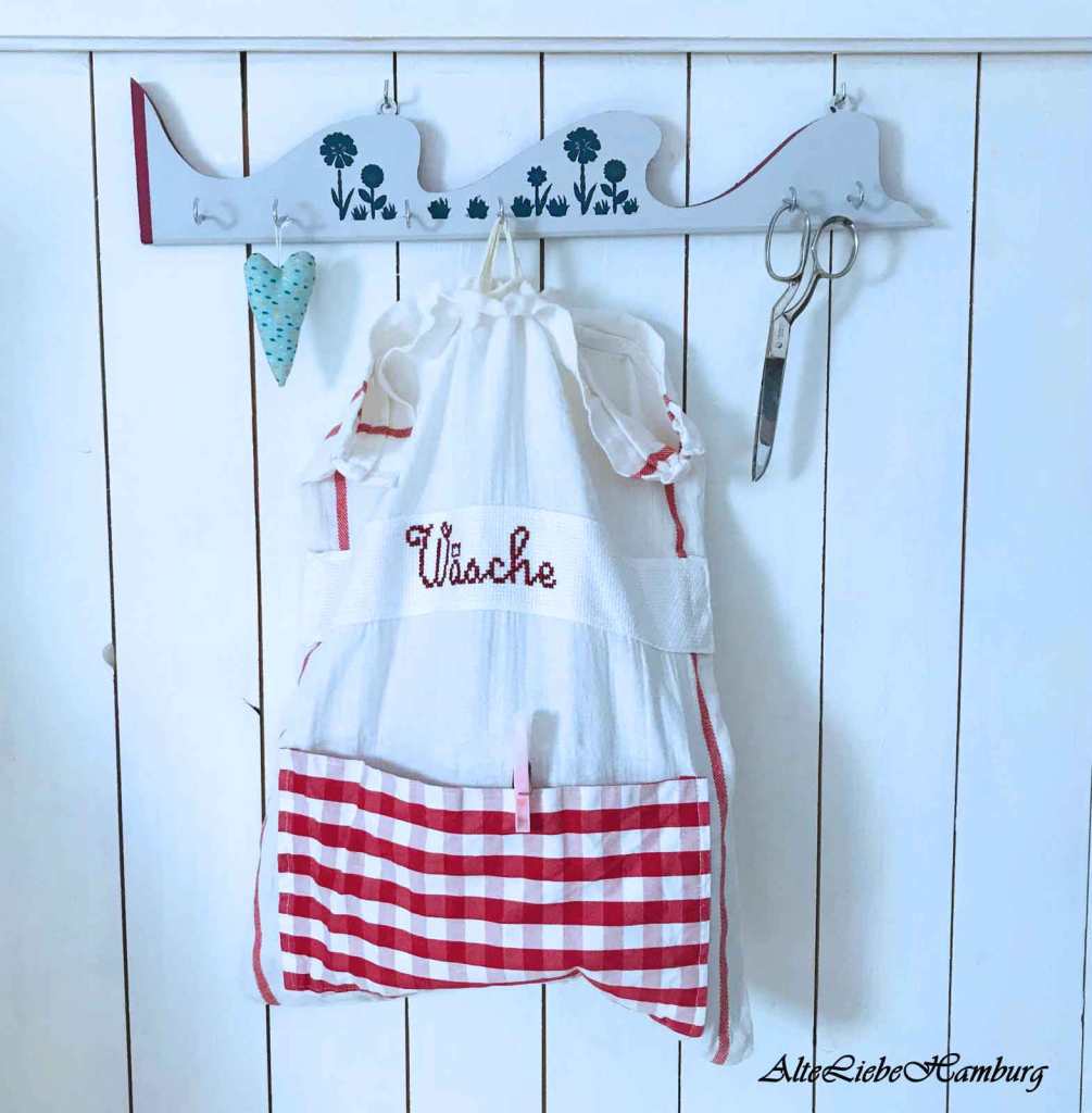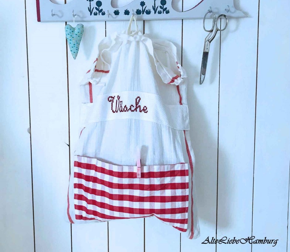 Gefertigt aus weißen Cotton, überzeugt der Wäschebeutel mit einer rot-weiß karierten Tasche, die ideal für die Aufbewahrung von Wäscheklammern ist. Direkt über der Tasche ist das Wort „Wäsche“ in einer Stickschrift aufgestickt, was dem Beutel eine persönliche und stilvolle Note verleiht.