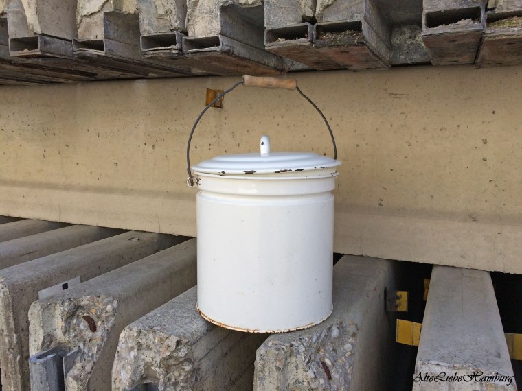 Alter Eimer aus Emaille mit Deckel und einem Henkel mit Holzgriff. Maße: Höhe ca. 30cm, Durchmesser ca. 30cm.