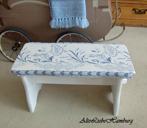 Als ich diese kleine Fußbank überreicht bekam, fehlten ihr nur ein paar Polsternägel, die sich mit der Zeit gelöst und herausgefallen waren. Hier konnte ich ein paar neue Polsternägel im Baumarkt kaufen und die fehlenden ersetzen. Der Stoff, das Holz und die hübsche Blumenstickerei im Kreuzstich gearbeitet, sind ohne Mängel und sehr gut erhalten. Das Fussbänkchen eignet sich auch wunderbar als Gebetsbank. Weitere Details wie Maße und Verkaufspreis der Fussbank erhalten Sie HIER im Shop von AlteLiebeHamburg.