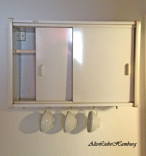 ….putzig sieht dieser Wandschrank aus den 50er/60er Jahren aus. Er hat zwei Schiebetüren, ein Einlegeregal und unterhalb des Schrankes sind 5 Haken befestigt, an denen können Tassen, Kaffee und Tee-Becker, Milchkännchen, Küchenschürzen, Nudelsiebe, Pfannen, Casserolen oder andere schöne Dinge aufgehängt werden. Dieser Schrank passt in jede Küche. Seine Maße: Breite ca. 51,5cm, Höhe ca. 37,5cm, Tiefe ca. 20cm. HIER geht es zum Schrank im Shop von AlteLiebeHamburg.