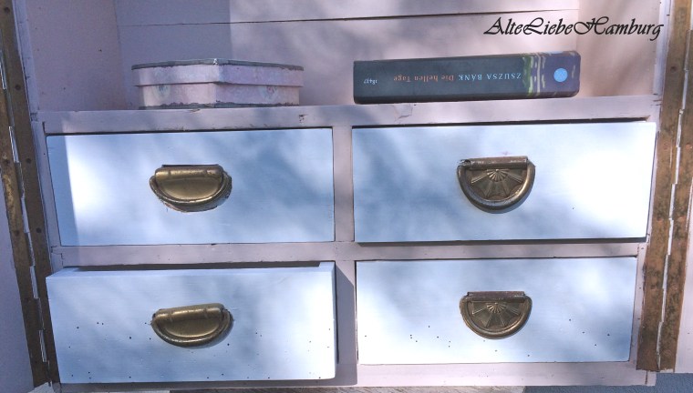 Dieser Wandschrank passt zu allem. Ob im Bad oder Küche, Wohn- oder Schlafzimmer. Er wurde früher als Hausapotheke benutzt. Ein klein wenig riecht es noch nach Medizin, wenn ich ihn öffne. Ein massiver, alter Schrank mit Hamburger Geschichte. Seine Maße: ca. 55cm hoch, ca. 33cm tief, ca. 47cm breit. HIER geht es zum Wandschrank.