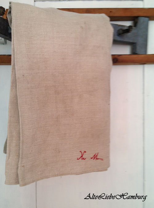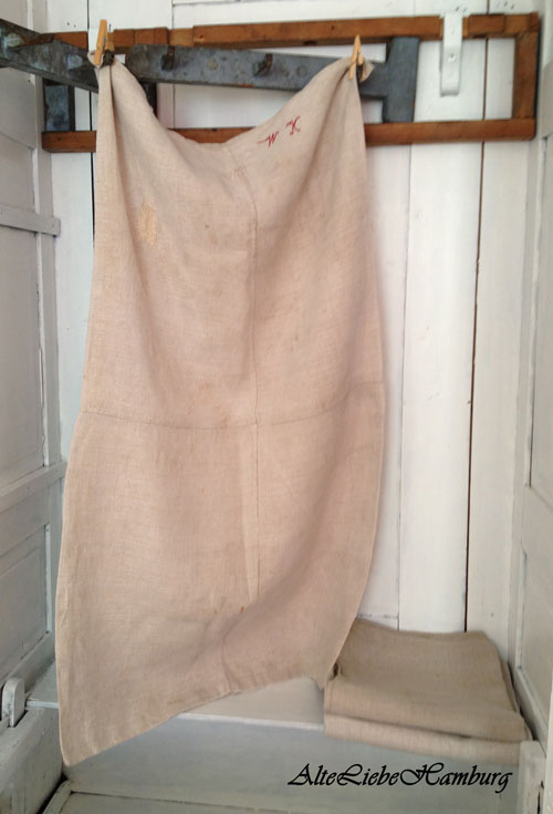 Die Leinenbeutel sind mindestens 100 Jahre alt und dienten früher in einer Wäscherei. Hier und da ist ein Stück Leinen ausgebessert und gestopft worden. Zwei Wäschesäcke haben ein gesticktes Monogramm mit rotem Garn. Für Sammler von alter Wäsche und altem Leinen ein sehr schöner Fund. Maße ca. 73 breit(einfach gemessen), ca. 120cm lang. Die Leinensäcke sind im HIER im SHOP von AlteLiebeHamburg erhältlich.