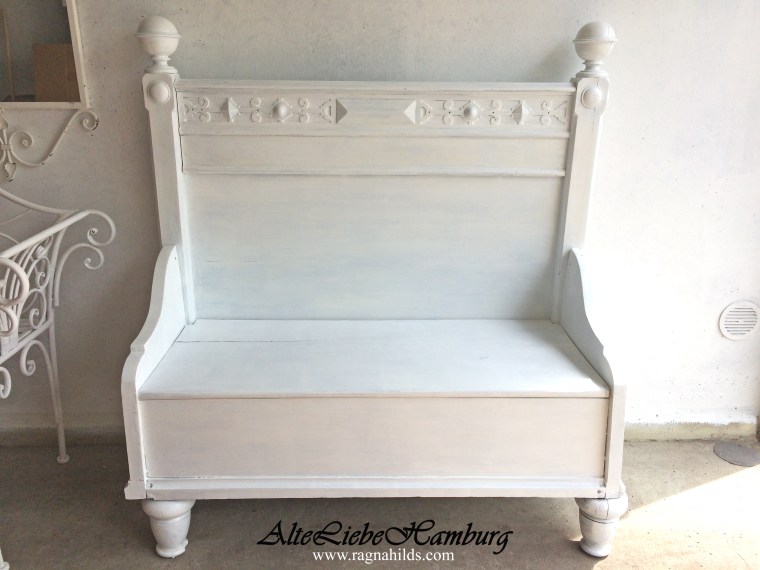 Diese süsse Truhe kam in einem recht unansehnlichen Zustand zu mir. Sie war nicht kaputt, sah aber mitgenommen aus. Zuerst habe ich sie gereinigt und mit einem weissen Farbanstrich verschönert. Dann eine Holzplatte mit Schaumstoff gepolstert und mit einem hübschen blauweißen Baumwollstoff beidseitig überzogen. Zu guter Letzt erhielt die Truhe ein herausnehmbares Inlay aus hellem Cotton.
