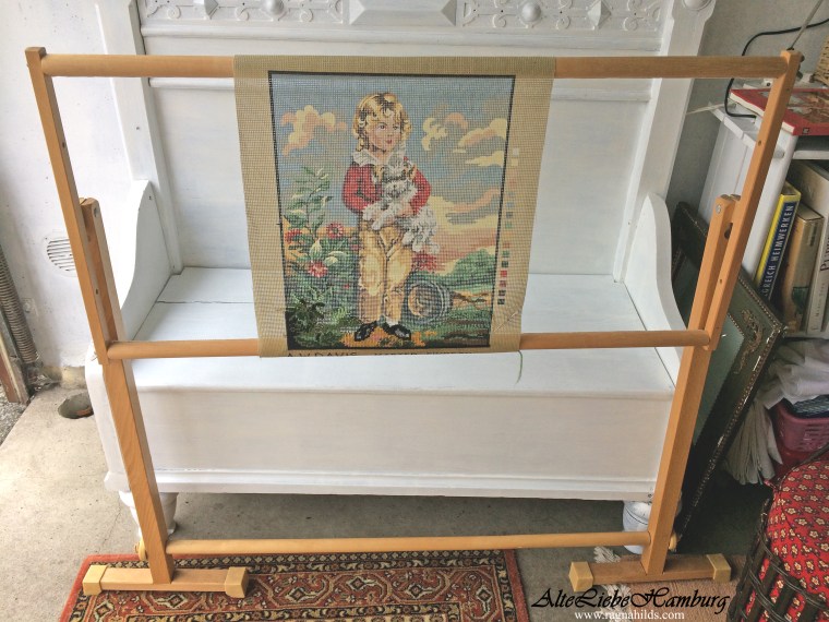 Weiter hat es mir der Holz-Stickrahmen für Gobelins angetan. Er gehörte einer alten Dame. Das Bild, welches in den Rahmen gespannt ist, war ihr letztes Werk, an das sie sich setzte. Um so mehr freut es mich, wenn der Rahmen einen neuen Besitzer oder eine neue Besitzerin findet, der diese Handwerkskunst des Gobelin knüpfen und sticken genauso liebt wie die alte Dame. Da bin ich sehr optimistisch!