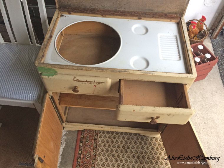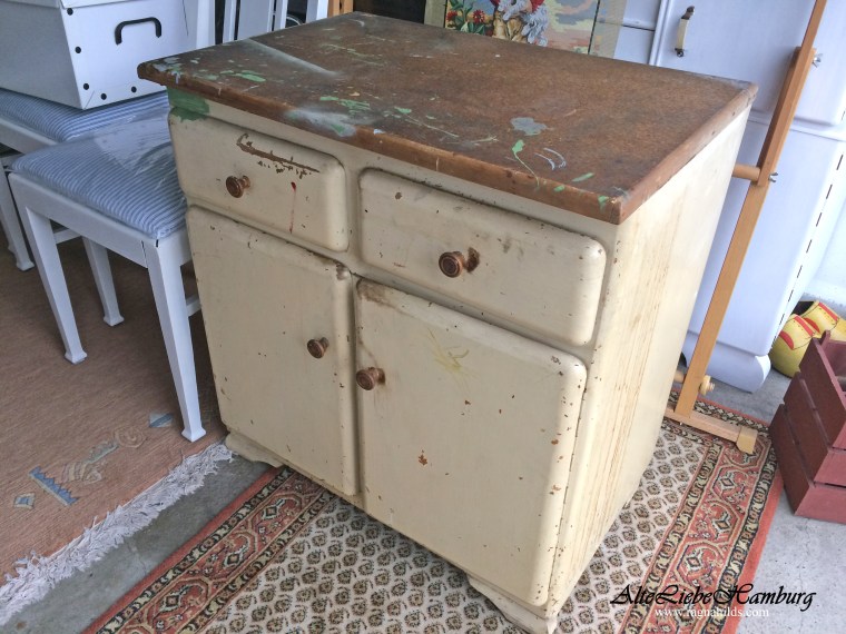 Heute Vormittag war es wieder soweit: Es ging nach Hamburg zum Möbel abholen trotz hartnäckigen Dauerregens und Staus verursacht durch Autobahnbaustellen. Aber das war so was von egal, denn es wartete ein neuer Schatz auf mich – eine alte Waschkommode! So süß in ihrer Form und Größe, aber in einem desaströsen Zustand!